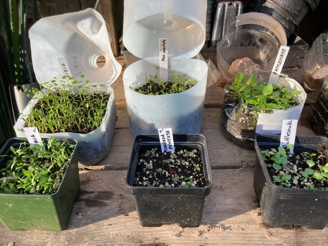 What did I do differently? First of all, I abandoned sowing straight onto the ground and only used open pots and milk jugs. Most importantly, on the advice of our member, Sarah Gallis, I used a seed medium, Pro-Mix BX, that I moistened before putting into the containers. I think this choice made a crucial difference. I also put the containers in the shade to prevent drying out.