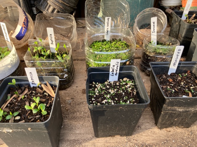 You can see from the pictures that the milk jug seeds did dramatically better for all six of the species I sowed “both ways”. That includes Baptisia australis, Lobelia cardinals, Vernonia noveboracensis, Zizia aurea, Monarda punctata, and Eryngium yuccifolium. Because of my previous results, I may have (ahem) slightly over sown and now am faced with overwhelming seedlings to transition to adulthood. Not a bad problem to have.